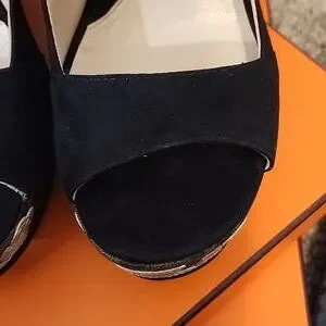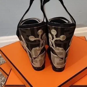 RARE NEVER WORN tried on but NEVER HIT THE PAVEMENT!.Step out in style with these elegant Fendi heels. Leather and Suede Featuring a chic black and gold design, these shoes are perfect for any occasion. Fendi Zucca Appliqued Experience luxury and comfort with every step. Leather and suede elastic sling backs Unique will grame your feet perfectly! PLEASE LOOK AT THE PICS TO DETERMINE UR OPINION ON CONDITION. slip ons