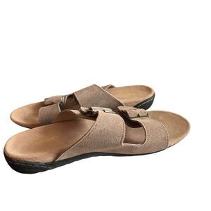 Really comfortable Birkenstock ish sandals with a comfortable and supportive yet squishy / cushy insole. They have nice arch supports and non skid rubbery soles. The suede is a beige / taupe / tan color is very clean. The rest of the shoes are clean and ready to wear as well. The Buckles are burnished brass and can be adjusted for a custom fit. They are in great condition - only worn a couple of times.