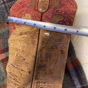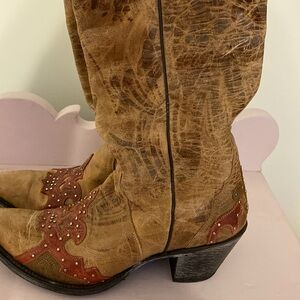 Stylish brown and red western boots with decorative accents. Soft leather, intentionally distressed, rivets intact. Pre owned