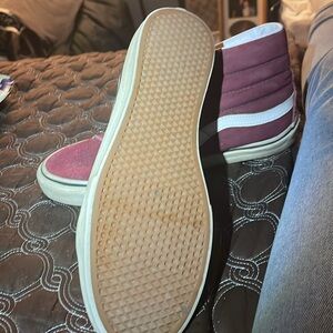 Stylish Vans high-top sneakers in burgundy. Features classic white stripe and laces.