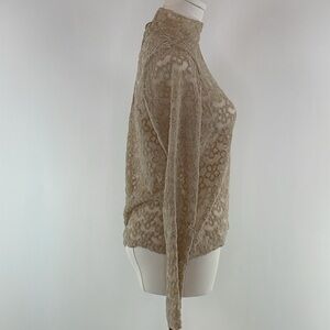 Yellow lace (45% Nylon, 45% Polyester, 10% Spandex). Top. Long sleeves. Turtleneck. Back button closure. 22" from shoulder to hemline. Imported.