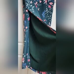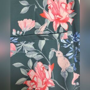 Endless Rose brand floral print wide-leg pants. They feature a high waist, a wide-leg silhouette, and a floral print in shades of teal, pink, and white. The pants also have a slit at the hem and pockets. They are made of 100% polyester.