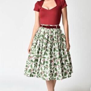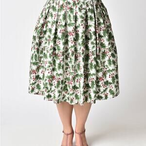 White & Holly Berry Cotton Skirt. Festive cotton swing skirt. Straight hemmed knee length. Belt loops, belt not included. Wrinkled from storage, Great condition.