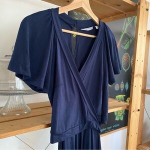 Super cute women’s Seraphine Navy Blue Nursing Maternity Dion Jumpsuit. Made in super-soft Lenzing™ Ecovero™ fabric, our maternity and nursing jumpsuit is that rarest of things - an ultra-chic style that's smart enough for work or special occasions but feels as comfy as your favourite pyjamas. The clever wrap-around bodice allows you to cinch your waist and adjust the fit as you grow while also concealing a secret second layer with easy nursing and pumping access. Flattering bump pleats and feminine flounce sleeves complete the look.
