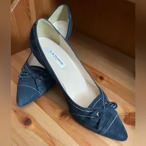 Elegant navy blue shoes by LK Bennett, perfect for any occasion. Features a stylish bow detail. Comfortable 3” heels, new, no box or dust bags , sorry. EU size 38 fits US 7.5 narrow feet