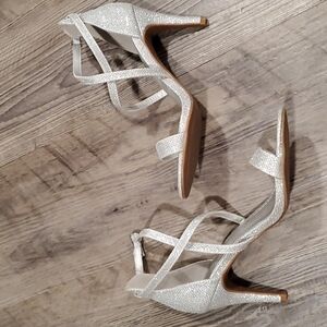 • These thin heel pump sandals come with crossed strap and adjustable buckle closure