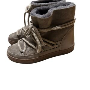 These tan ankle boots feature a soft suede and leather material, providing a stylish and textured appearance. The fuzzy lining at the top ensures warmth and comfort, making them perfect for cooler weather. With a rounded toe and light-colored laces, these boots offer a classic yet trendy look.