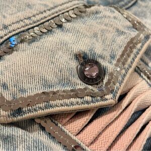 This vintage 1980s Extra Blues brand Jean Jacket has been customized by hand with gems, beads, and sequins. Under both of the front pockets are a gorgeous pink twisted Jean open design. Every button has a pink gemstone inside. The back of the jacket is hand beaded with a vintage Bentley in the middle and black beaded flowers on the sides. On the side of the right arm is the original extra blues brand embroidered patch with palm trees and the sun outlined in blue and pink.