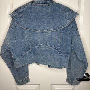 This cropped denim jacket features an eye-catching oversized bib collar that adds instant edge. A unique twist on a classic staple—perfect for layering with your favorite basics. Great condition, ready to elevate your streetwear game. Bib collar is Removable.