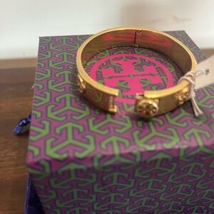 Luxurious Tory Burch gold tone logo bangle bracelet. Lovely and classic style, this bracelet is an oval shape that measures 2.5” in diameter, 0.5” across. It has a hinge with a sliding closure and is embellished with the iconic stacked T logo. Excellent condition, box and dust bag included.