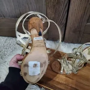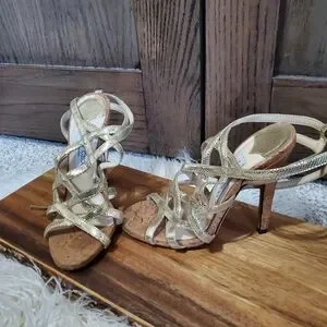 Elegant gold strappy heels. Cork heel platform design. Perfect for any occasion. size 36 or US 6. excellent condition only worn 1 time for a short while. no box or bag. authentic.