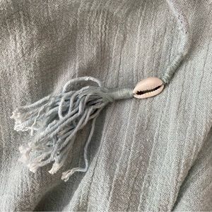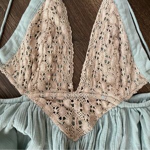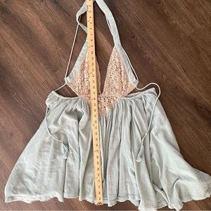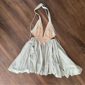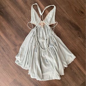 Free People Seafoam Green Blue Crochet Trapeze Asymetrical Mini Dress XS. Gorgeous seafoam color with beige crochet detail and cute sea shell embellishment on straps. Raw hem, flowy and boho bohemian look perfect for summer, vacation, festival or resort wear. Sexy cute backless design and hi lo hem.