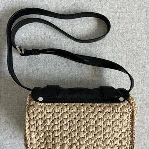 Stylish woven crossbody bag with black leather accents. Perfect for any occasion.