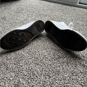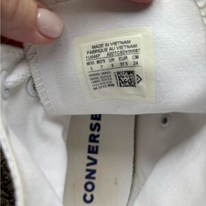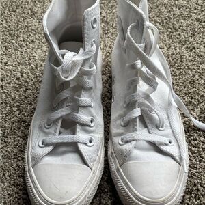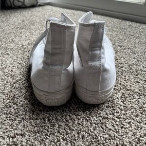 These Converse high-top sneakers feature a timeless white canvas design, complete with a rubber toe cap and durable rubber sole. The iconic circular logo patch adds a subtle touch of brand authenticity, making them a stylish choice for everyday wear.