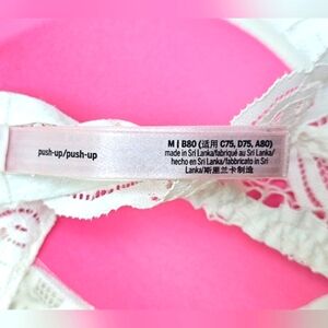 In great condition, like new almost! Beautiful off white cream colored with floral lace pattern design and hot pink lined. Push up with adjustable straps at neck and adjustable clasp on back. Soft and comfortable.