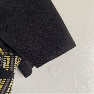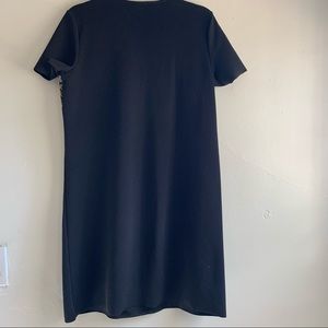 Zara tribal print dress in size small. Black, short sleeve, v-neck, shift dress with textured tribal print in orange, mustard yellow, ivory and tan. Unfinished hem on sleeves and bottom hem.