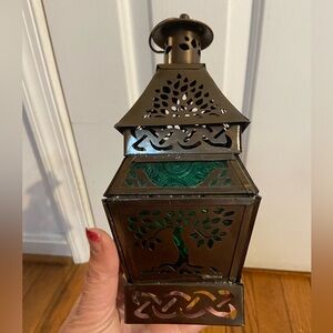 Dark Copper Tone Tree of Life Moroccan Style Lantern With Green Textured Windows