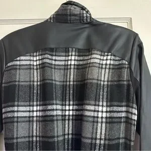 This fun and flirty black and gray plaid pattern jacket, complemented by an asymmetrical draped front. The wide, folded collar adds a touch of drama, while the solid black faux leather sleeves with zipper detail provide a sophisticated contrast. There are two front pockets and an optional belt. Measurements: pit to pit 22 inches, center back length 28 inches. Dry clean. Material listed in photo. Very good condition. Smoke free home.