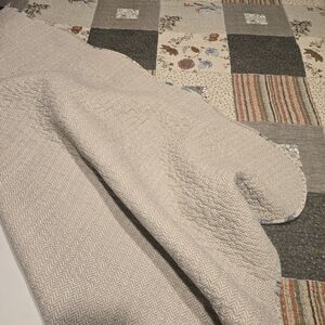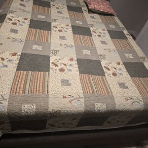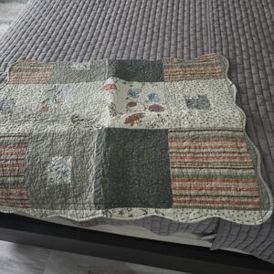 Cozy up with this elegant patchwork quilt featuring a soothing green and cream palette. Perfect for adding a touch of warmth and style to your bedroom.