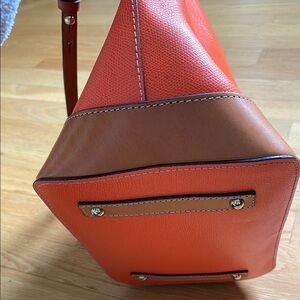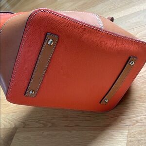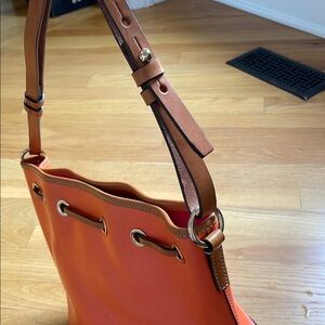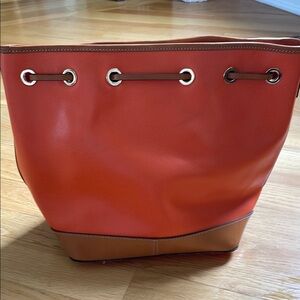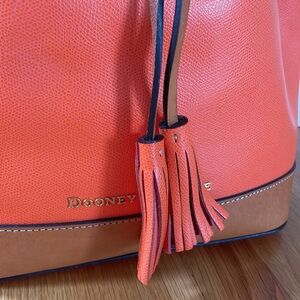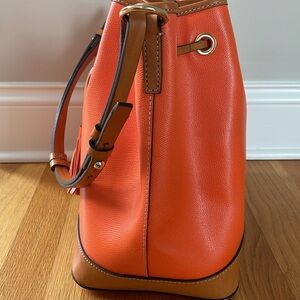 This Dooney & Bourke tote bag showcases a vibrant orange and tan color scheme, crafted from a textured leather material for a luxurious feel. Its spacious bucket design offers ample storage, while the drawstring closure and decorative tassel add a trendy touch. This one is stunning and gorgeous in all seasons.