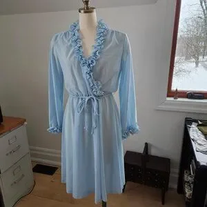 Soft, sheer, and effortlessly romantic, this vintage 1970s dress features a faux wrap front with delicate ruffled trim, long sheer sleeves, and a flowing silhouette. The elastic waistband provides a comfortable and flexible fit, making it as wearable as it is elegant. A dreamy vintage dress for any wardrobe.