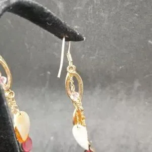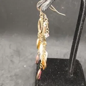 A pair of earrings with long gold tone chains holding tiny charms. No brand marks found.