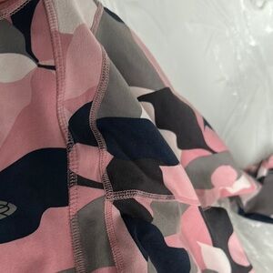 Pink , navy gray camo print sports bra and leggings with pocket on the back