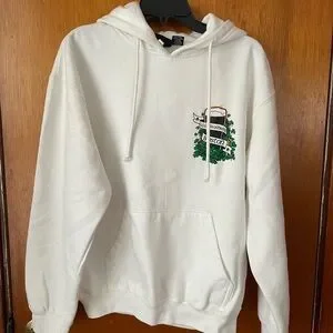 Stylish white hoodie with a unique graphic design. Perfect for casual wear. Has a small pen mark on the front pouch.
