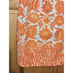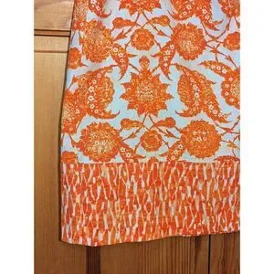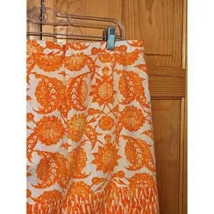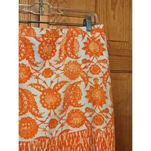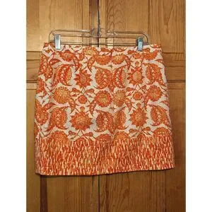 This Michael Kors mini skirt features a bright clementine paisley pattern, perfect for adding a pop of color to your summer wardrobe. The skirt is made of a comfortable and stretchy cotton blend fabric, making it ideal for travel and casual occasions. It has a zip closure, and the garment care label indicates that it is machine washable.
