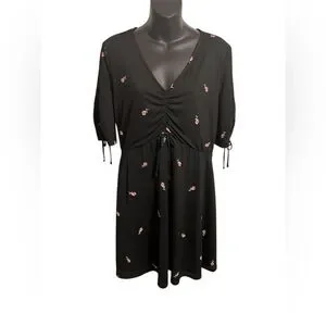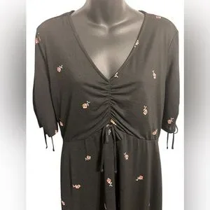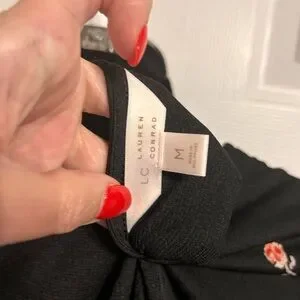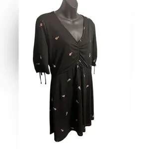 In excellent condition! Black dress with little pink floral detailing. Has ties on sleeves and bust. Brand is Lauren Conrad, size medium.
