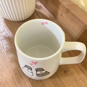 Enjoy your favorite beverage with this charming white mug featuring a cute salt and pepper design. Perfect for adding a touch of fun to your dining experience. “We go together like salt and pepper” quote on mug with pink dainty hearts motif. Super cute and cozy. In great condition. Dishwasher and microwave safe. Prima design brand.