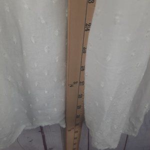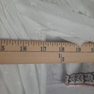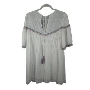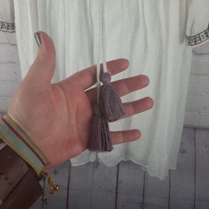 Short, round neck dress with long sleeves and ruffled cuffs. features floral embroideries on the front and interior lining.Fastens at the back with opening and bow pompoms.