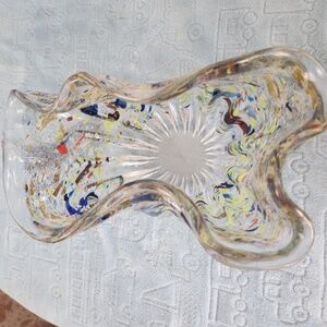 The item is a vintage Murano glass bowl, likely crafted in the mid-20th century in Italy. Key features include: