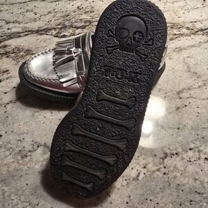 These silver T.U.K. lug women's loafers feature a solid silver upper material with a round toe shape and slip-on closure for easy wear. The shoes have a low wedge heel and are suitable for various occasions such as travel, activewear, casual outings, and workwear. With a metal theme and standard shoe width, these loafers are a stylish and comfortable choice for the seasons of winter, summer, fall, and spring.
