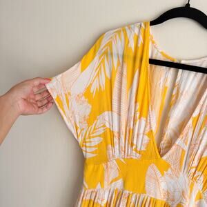Cupshe Yellow + White Floral Print Short Sleeve V Neck Empire Waist Maxi Coverup