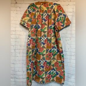 Embrace vibrant style with this floral patchwork dress. Perfect for any occasion. This is a size L. The bust is 42 inches, hips are 48 and the length is 43. Enjoy!