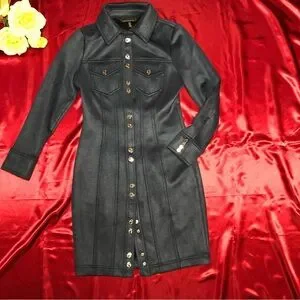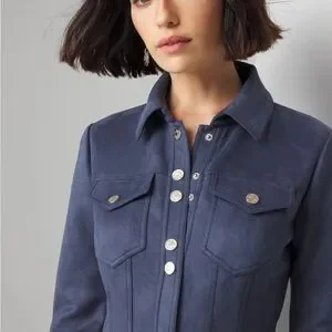 Our new shacket dress delivers fresh style with beloved jean jacket inspo in a much longer length. It's so soft and so chic in faux suede with front seaming and a glossy button front closure. Wear opened as a top layer or closed as a dress.