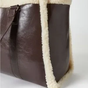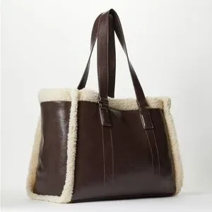 Stylish brown faux leather tote with cream faux shearling trim. Perfect for everyday use.