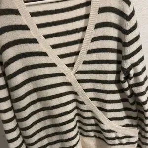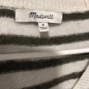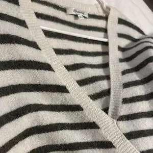 This Madewell sweater features a classic V-neck design with a chic black and white striped pattern. Crafted from a comfortable knit fabric, it offers a relaxed fit perfect for everyday wear. The long sleeves and standard length make it a versatile addition to any wardrobe.