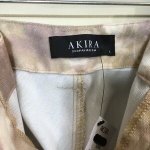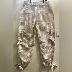 NWT AKIRA ‘Quinn’ Relaxed Cargo Pants Mottled tie dye camo effect with muted lilac, greens, and taupe colours. 100% heavy polyester Front zip with dual hook clasp. Two front pockets, two side cargo snap button pockets, two back snap button pockets. Ankle ties and adjustable waist. Size L Waist 15”-18” Rise 13” Inseam 30 1/2” Length 43” First three photos are stock My photos have terrible lighting! Pants are a little darker than stock photos. Smoke free, cat friendly home.