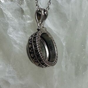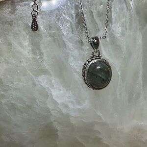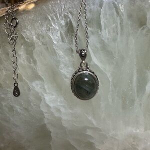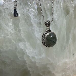 This elegant silver pendant necklace features a stunning labrodorite stone centerpiece. Perfect for adding a touch of sophistication to any outfit.
