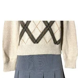 Vintage Evan Picone Tan & Brown Argyle Turtleneck Sweater Top made from an Angora Blend of Ramie and Rabbit Fur. The rabbit fur gives this sweater that soft warm fuzzy feel, while the Ramie gives the sweater tough durability. This sweater top is in excellent condition, women's size medium with measurements of: Pit to Pit 20", Shoulder to Shoulder 17' and Length Top to Bottom 23"