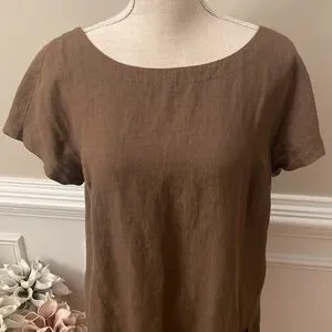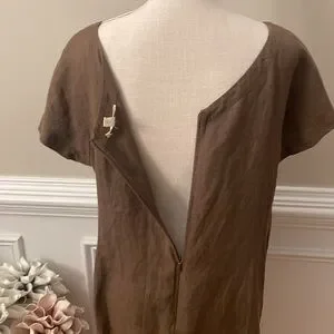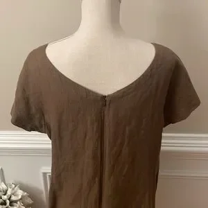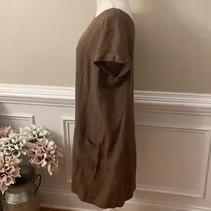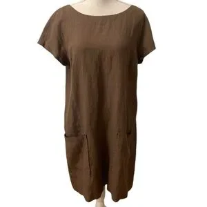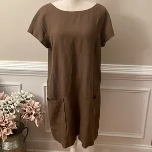 Eileen Fisher Brown Linen Ballet Neck Front Pocket Shift Dress Size Medium