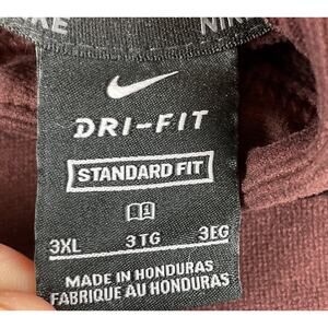 This Nike Training Therma hoodie is a 3XL burgundy pullover sweatshirt with a high neck, drawstring closure, and long sleeves. Made of polyester, it features a relaxed fit, hood, and logo accents. Ideal for cross-training in winter or summer, this machine-washable hoodie includes pockets and is designed for big and tall men.