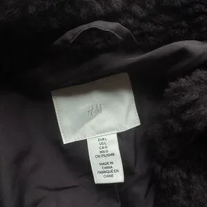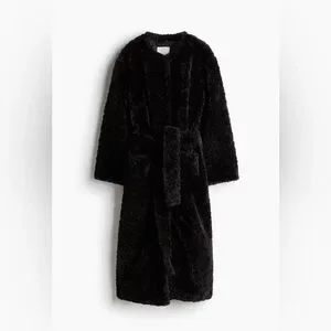 Loose-fit, calf-length coat in fluffy fabric. Round neckline, concealed buttons at front, and a wide, removable tie belt at waist. Open front pockets and vent at back. Lined.