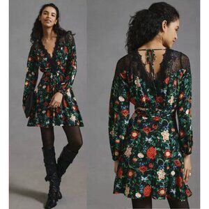 BY ANTHROPOLOGIE Lacy V-Neck Mini Dress Floral Dark Romantic Lace Size US 4 NWT