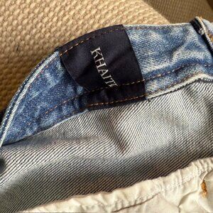 This model is still in stores and hasn't been marked down. I don't think they've been worn. Khaite Abigail stretch jean in Bryce wash. size:25 waist:26 hip:33 5/8" inseam:28 1/2" rise:11 1/8". A cropped length balances a high rise, creating fresh and flattering proportions with classic straight-leg styling and hand finishing. Denim (98% cotton, 2% polyurethane) Place in freezer overnight or hand wash.