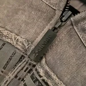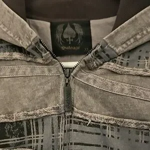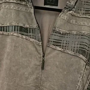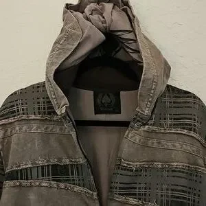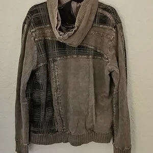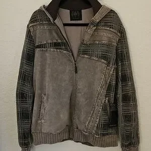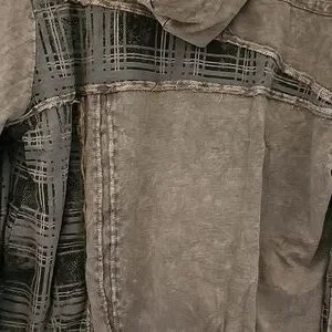 Stylish gray plaid jacket with unique design. Features a zip-up front and detailed stitching. Hood attached, 2 front pockets.