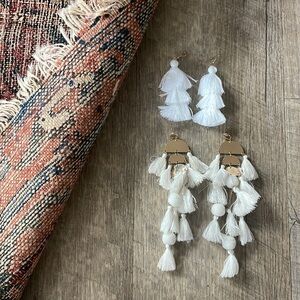 Bundle of two pairs of gently loved fringe earrings. One pair features an off-white tiered gold metal piece and white fringe and the other is new in original packaging, white tiered fringe earrings with extra backs. For pierced ears. Costume jewelry only
