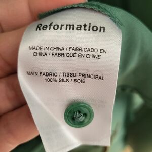 Reformation Catalina 100% silk midi dress. Button front shirt dress style with tie in the back that allows for some adjustment at waist. New, one of the two original tags attached at bottom hem. Dress has small hole/flaw under arm of dress. Along the seam, so should be able to be repaired if desired. Gorgeous shade of green would be perfect for a spring event. See photos for details and measurements.